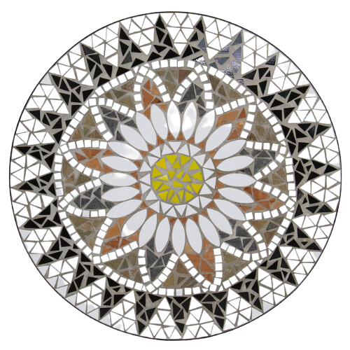 - The table top is made out of small coloured ceramic tiles, hand laid and then grouted in a mosaic pattern.